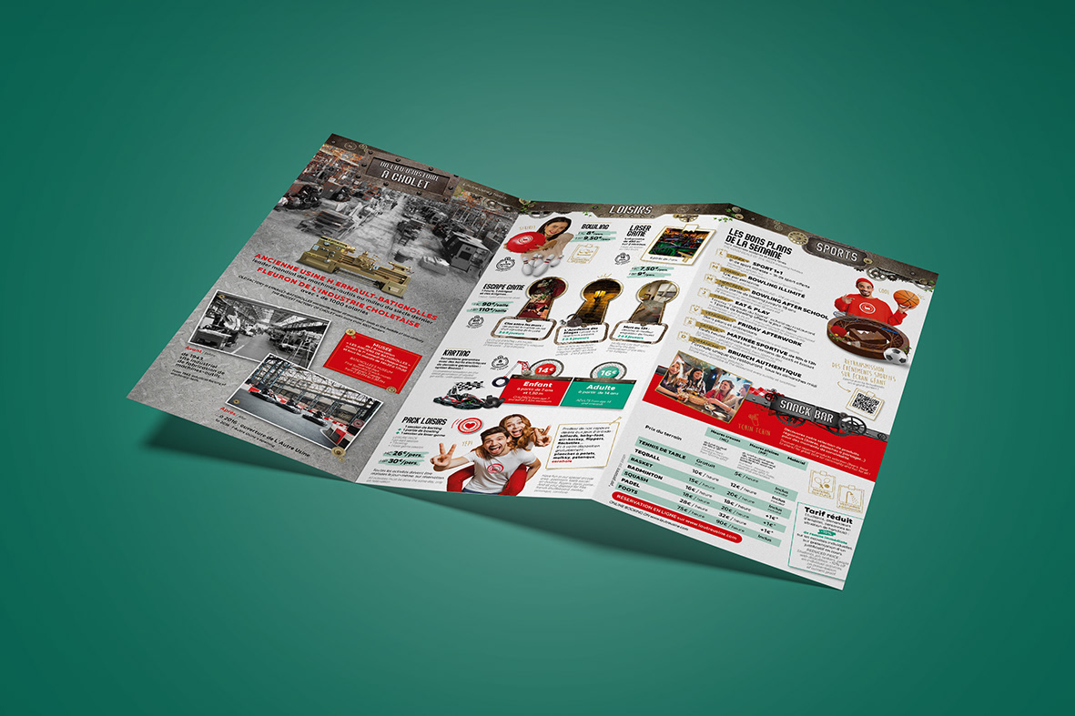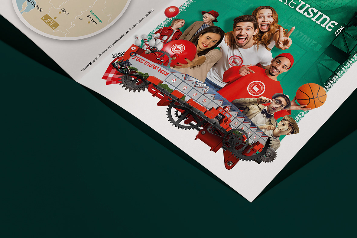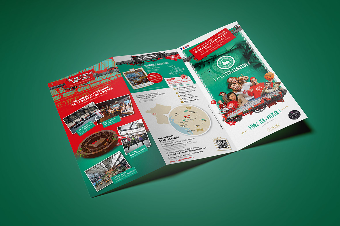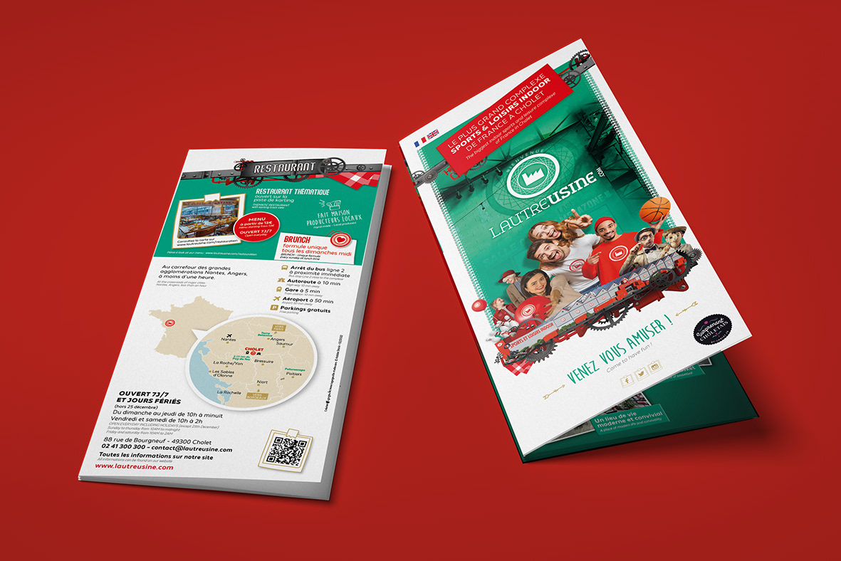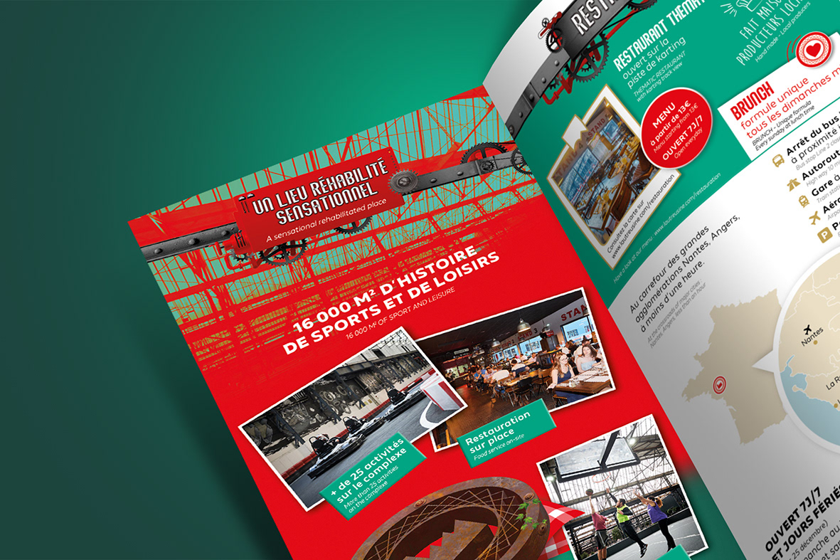 L'AUTRE USINE - Complexe sports & loisirs ( Cholet 49) : Création d'un dépliant touristique bilingue avec une nouvelle identité visuelle mettant l'accent sur l'esprit industriel du lieu basé sur une ancienne usine / Design by Anne Leroux® 2022